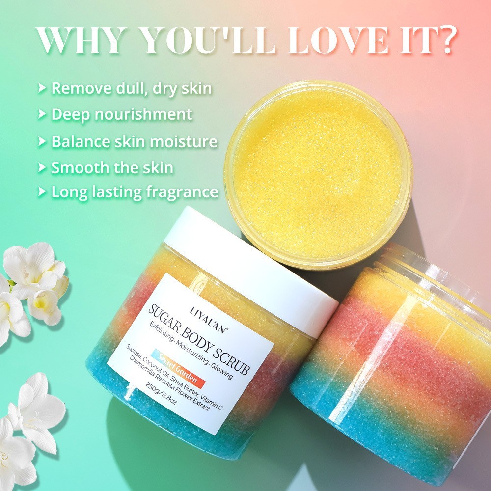 OEM奢华分层秘密花园糖磨砂膏body scrub沐浴身体磨砂去角质膏