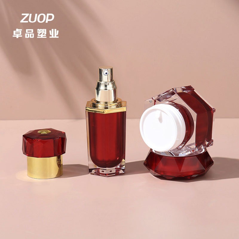 定制膏霜乳液精华喷雾按压瓶化妆品分装瓶 酒红色六角亚克力套装