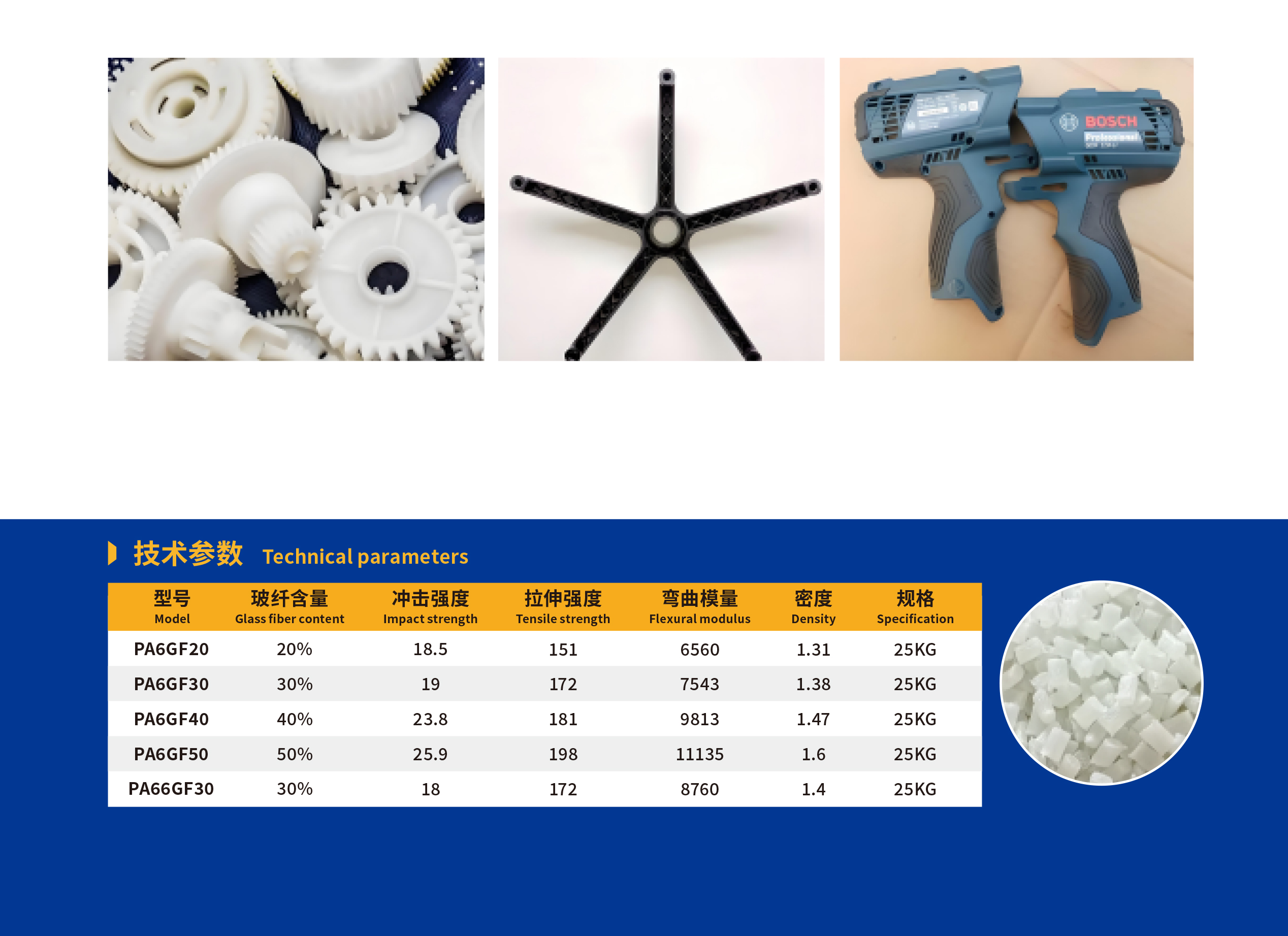 增弹尼龙是在胃通尼龙(聚酰胺,PA)的基础上,通过添加增强材料料维进行改性处理后得到的一种高性能工程塑料。以后量州脂为基础,常见的有PA6,PA66此外还有PA610,PA12、PA46等,不同种类的尼龙基体决定了材料的基本性能,