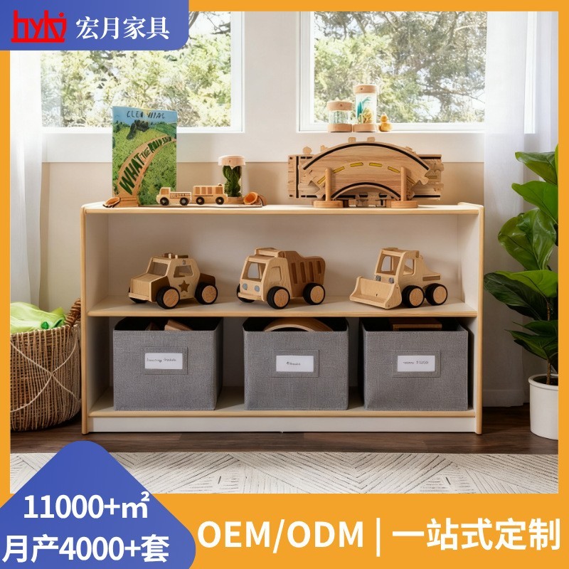 浙江宏月家具有限公司发布的幼儿园双层玩具收纳柜木质儿童储物架绘本展示书架可OEM定制图集库