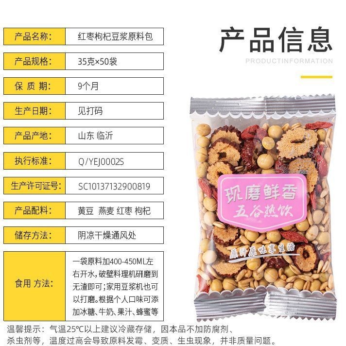 山东伊尔健食品有限公司发布的现磨熟制五谷豆浆原料包红枣枸杞味黄豆燕麦早餐杂粮包粥料包图集库