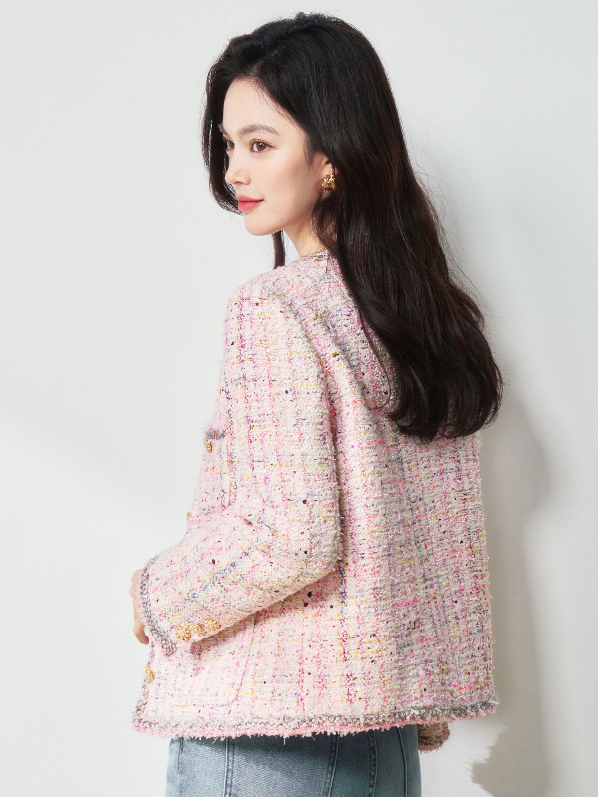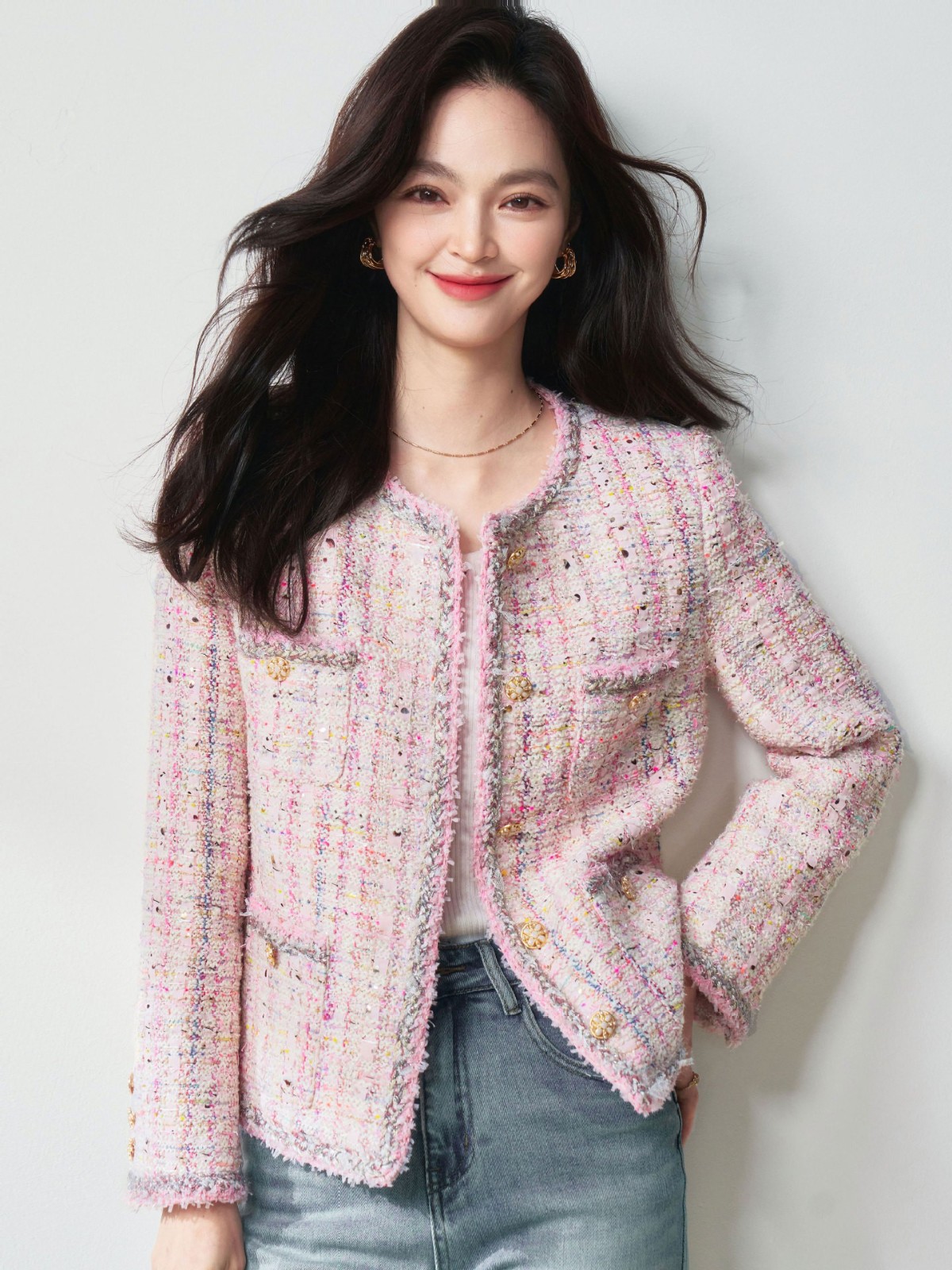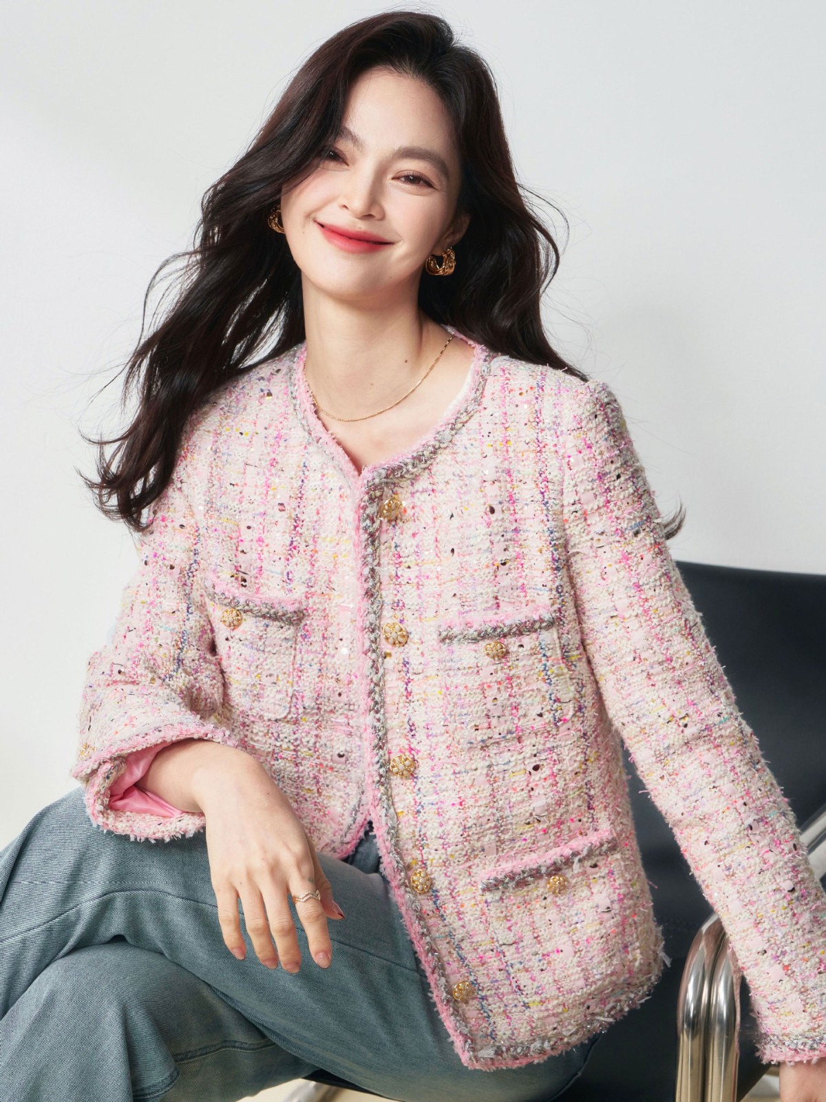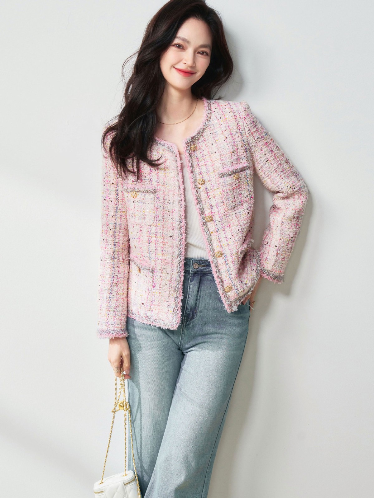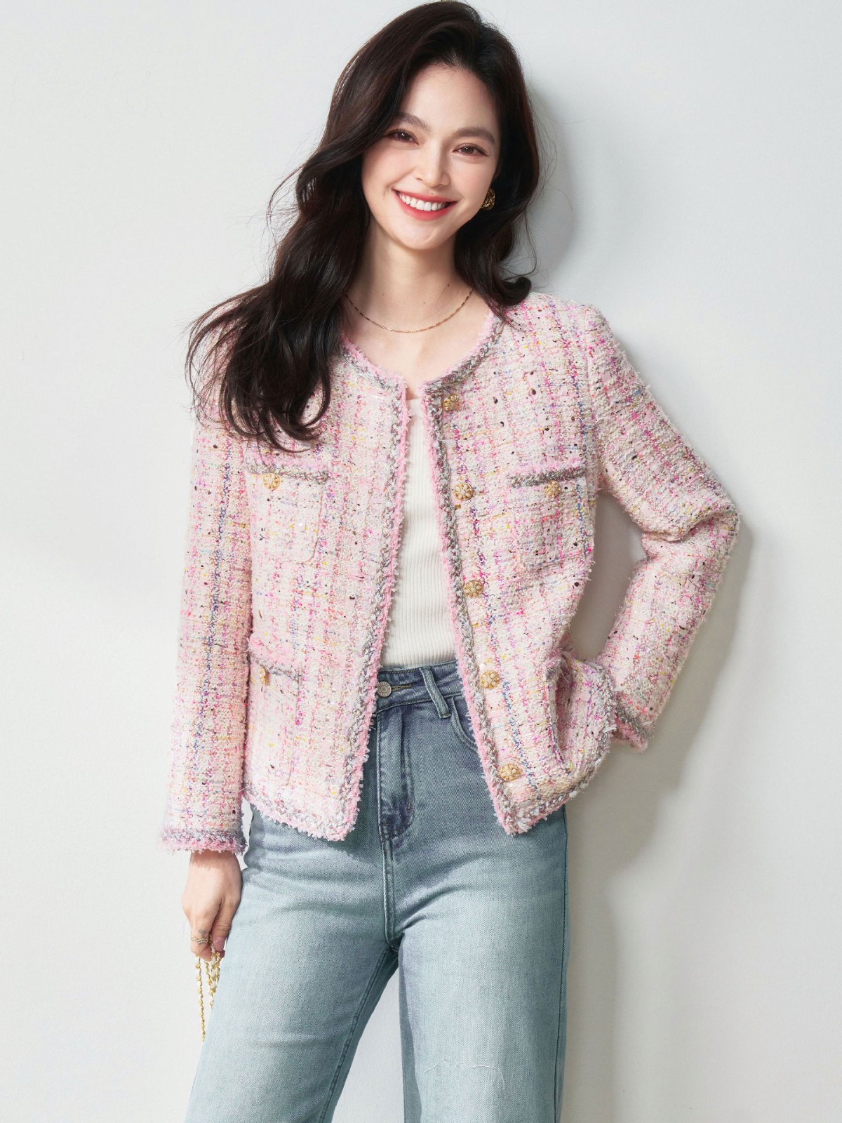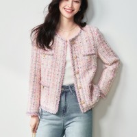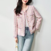 滁州盛宏服装有限公司发布的26春季高奢法式千金风浪漫樱花粉羊毛花纱粗花呢小香风外套图集库