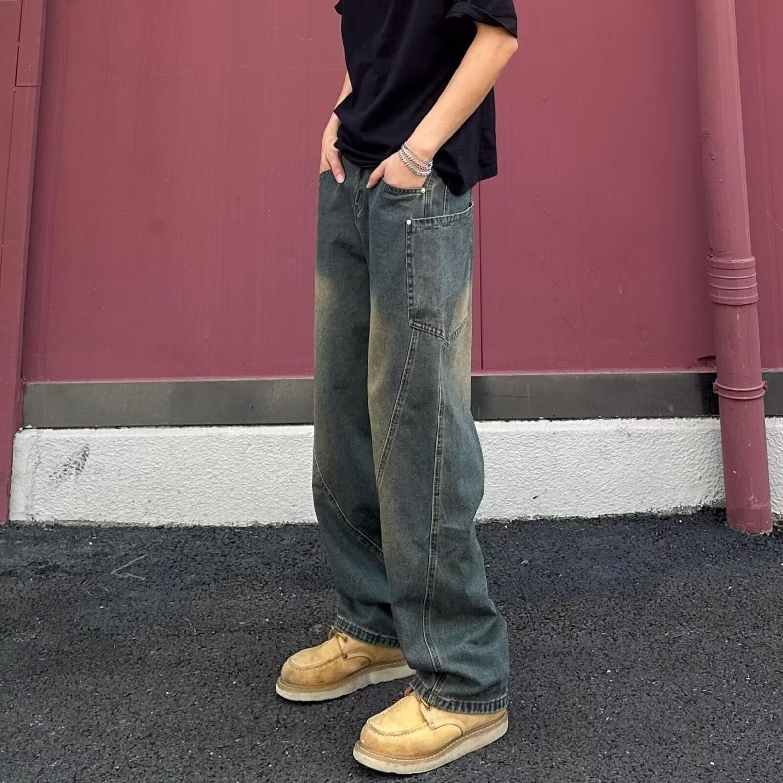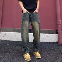 揭阳市泓瀚服装有限公司发布的美式高街弯刀牛仔裤男款春秋潮牌痞帅炸街裤子cleanfit直筒微喇裤图集库