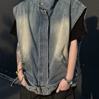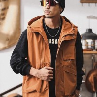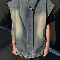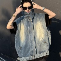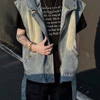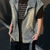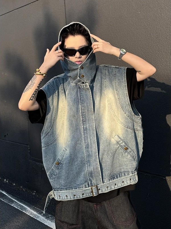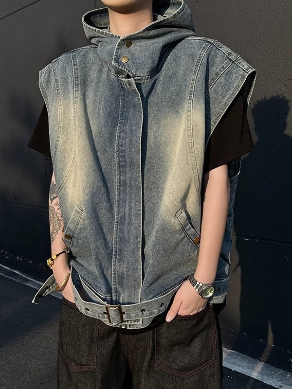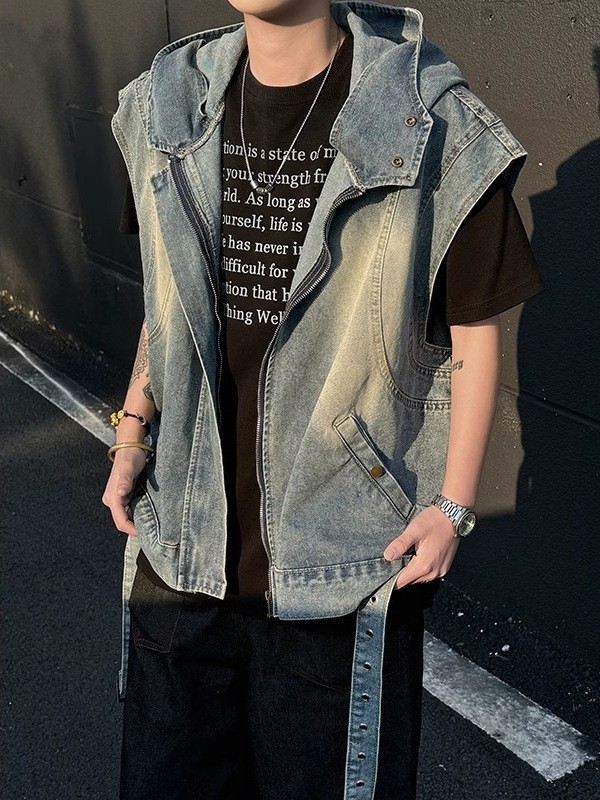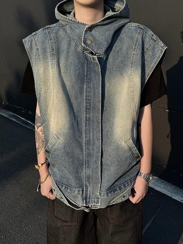 揭阳市丹斯格尔服饰有限公司发布的做旧水洗牛仔无袖坎肩马甲男生美式复古连帽工装解构拼接背心外套图集库