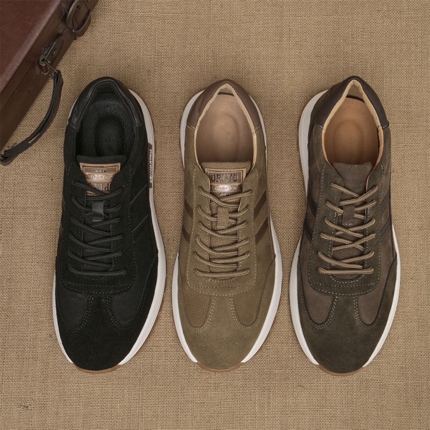 东莞市淘派鞋业有限公司发布的男士时尚休闲皮鞋复古配色潮流德训鞋户外徒步头层牛皮慢跑鞋图集库