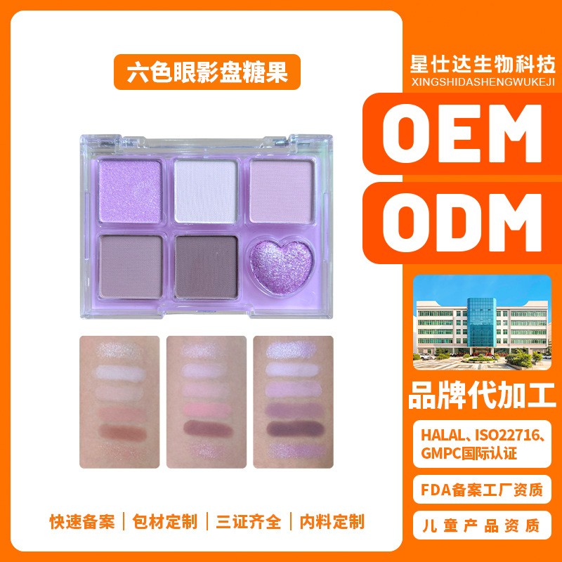 广州星仕达生物科技有限公司发布的OEM ODM六色眼影盘哑光珠光紫色粉色闪光心形彩妆定制代工图集库