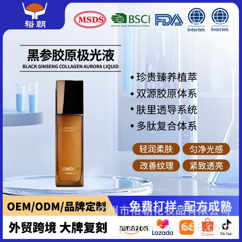 广州市裕朝化妆品有限公司发布的裕朝黑参胶原精华爽肤水OEM外贸代加工焕肤提亮淡纹紧致精华水图集库