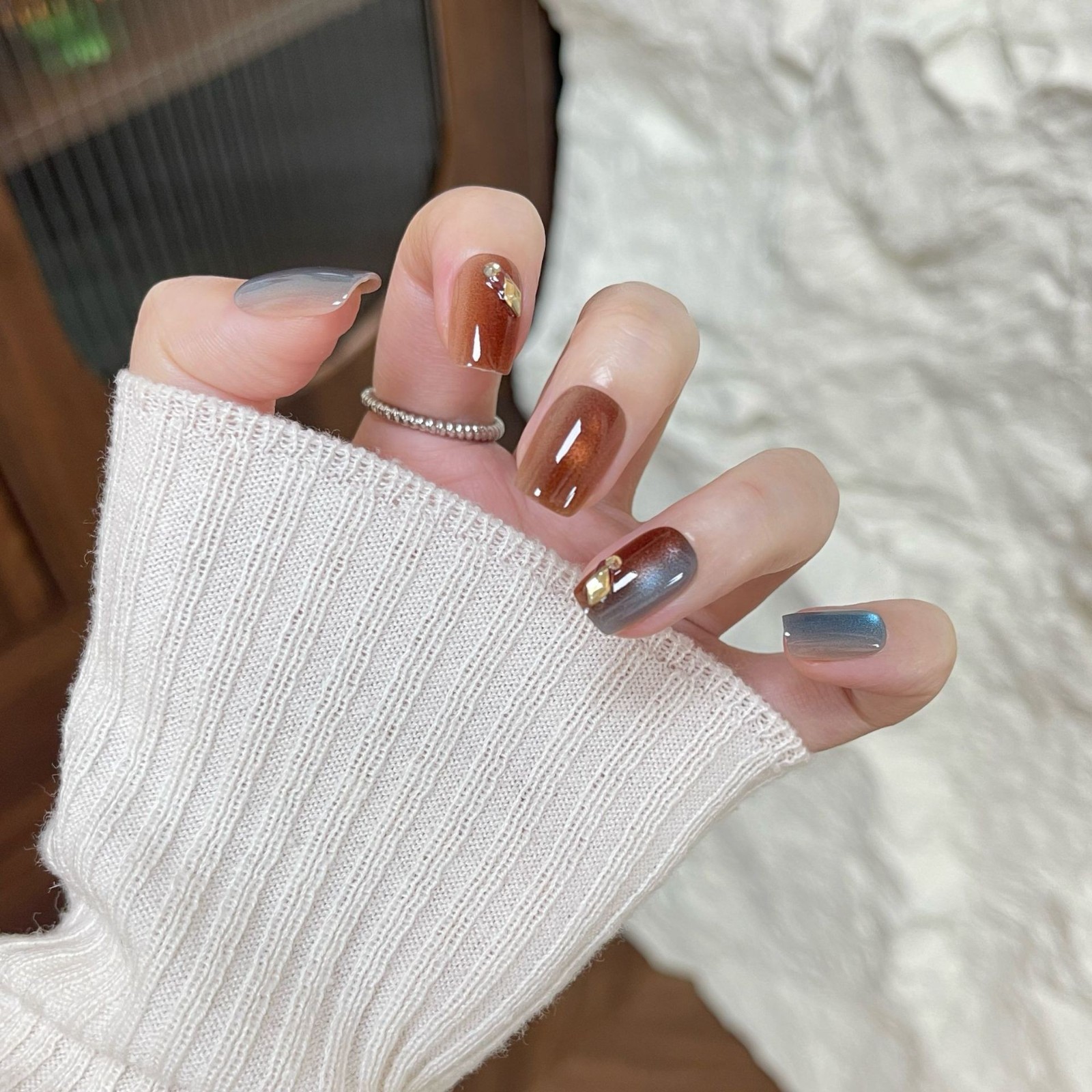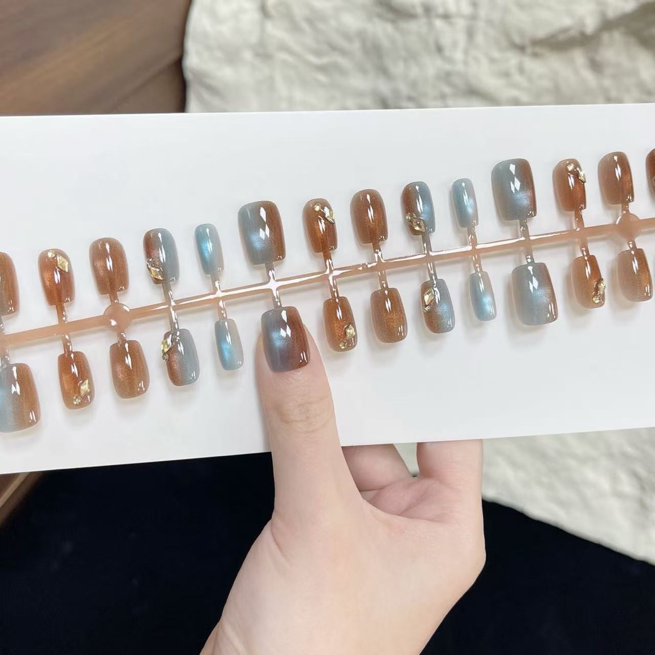 金华市睿熠化妆品有限公司发布的棕蓝碎钻美甲穿戴甲香槟闪钻指甲贴秋冬气质假指甲穿戴甲片预制甲图集库