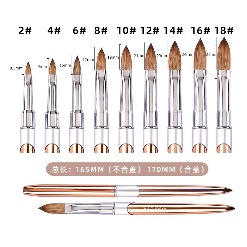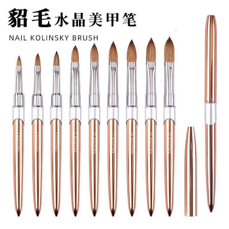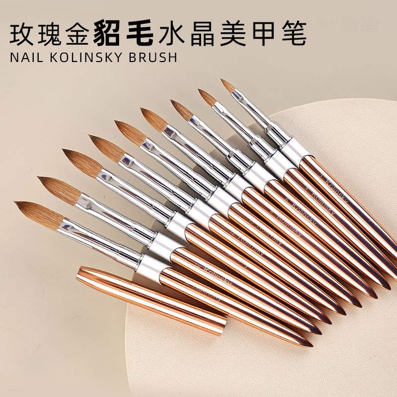 进贤县豆蔻美妆美甲笔刷厂发布的工厂定制貂毛水晶美甲笔 玫瑰金属杆美甲水晶雕花笔Kolinsky笔刷图集库