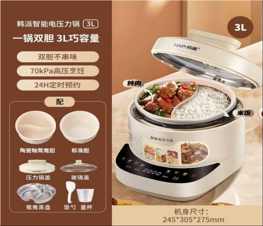 广东韩派电器有限公司发布的2025年新款电压力锅3L鸳鸯不粘锅蒸盘源头工厂OEM定制图集库