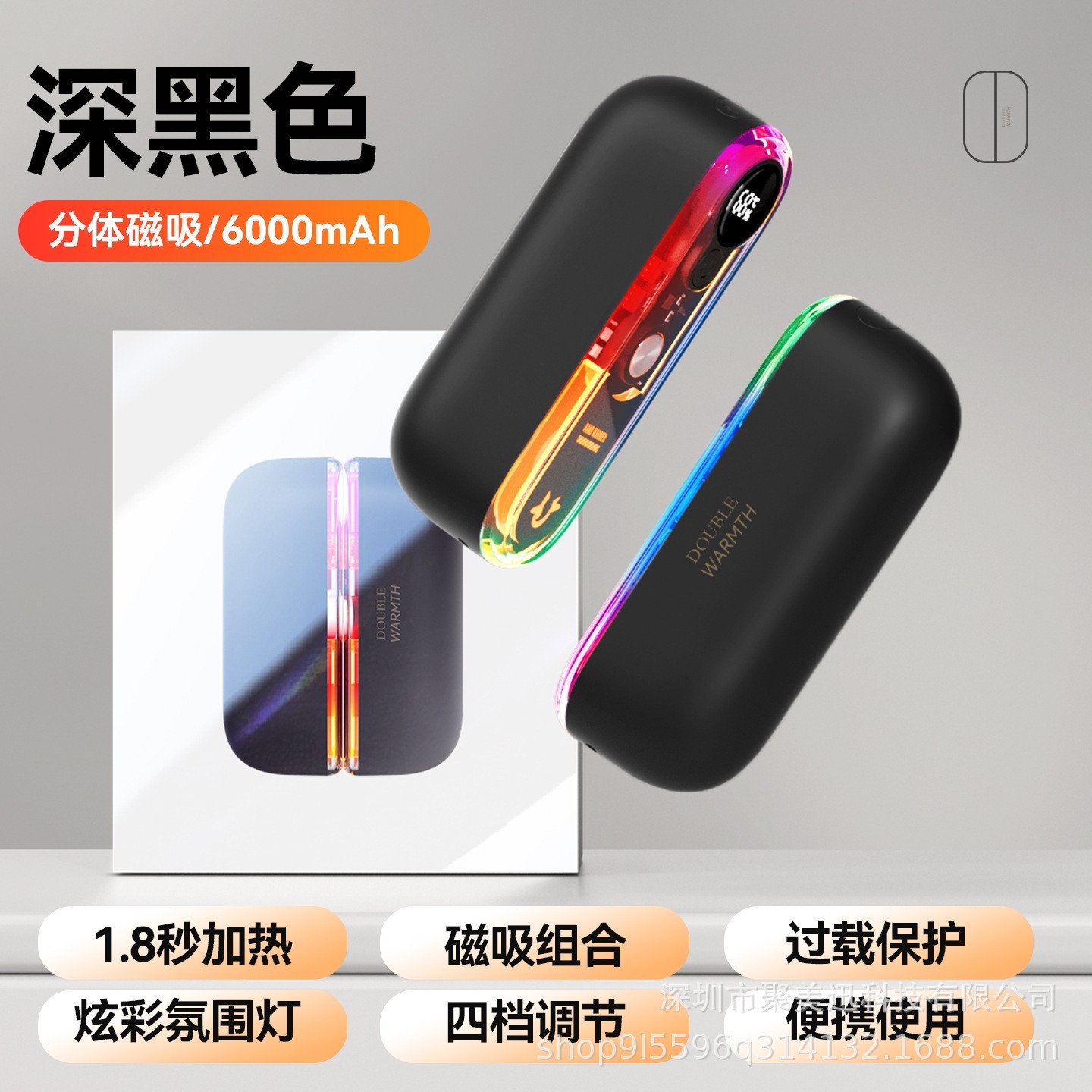 深圳市聚美迅科技有限公司发布的跨境磁吸分体式炫彩灯暖手宝迷你便携式二合一数显暖手宝USB充电图集库