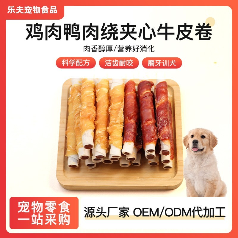 乐夫宠物食品(山东)有限公司发布的定制厂家直销狗零食鸡肉鸭肉绕夹心牛皮卷大小型犬宠物零食代加工图集库