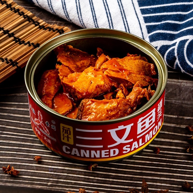 大连市金州区圣冈水产品加工厂发布的大连茄汁三文鱼罐头定制水产海鲜贴牌代加工厂商用OEM三文鱼罐头图集库