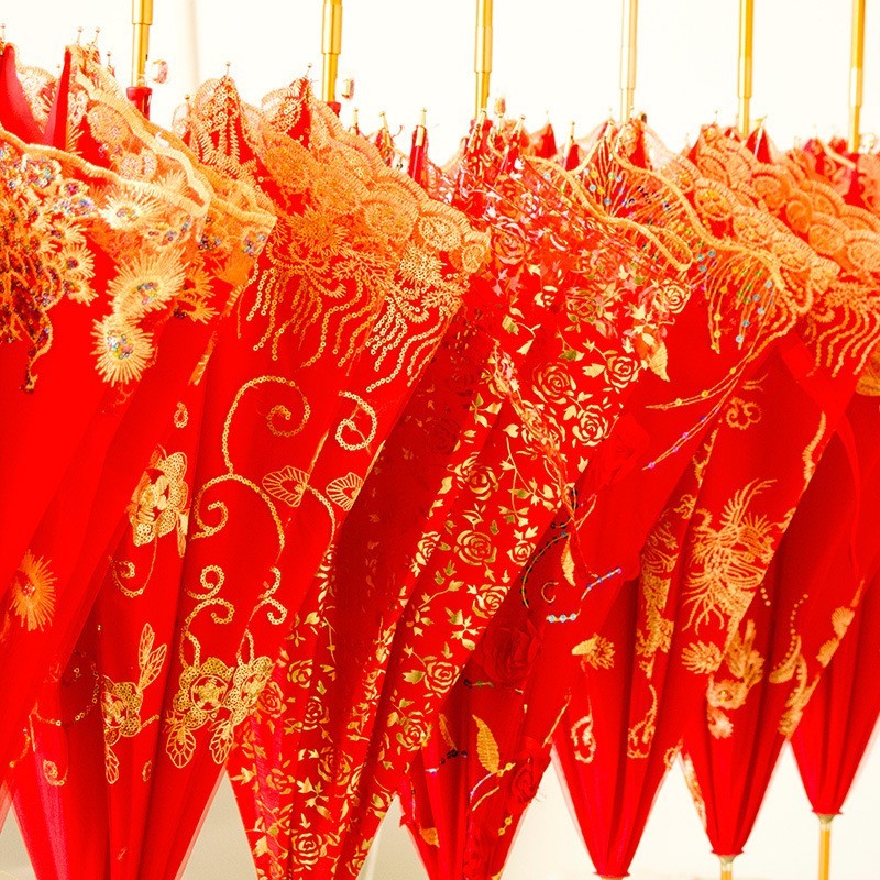 杭州栀子花伞业有限公司发布的红色雨伞结婚新娘伞婚庆婚礼高档蕾丝花边刺绣大红色长柄喜庆雨伞图集库