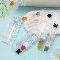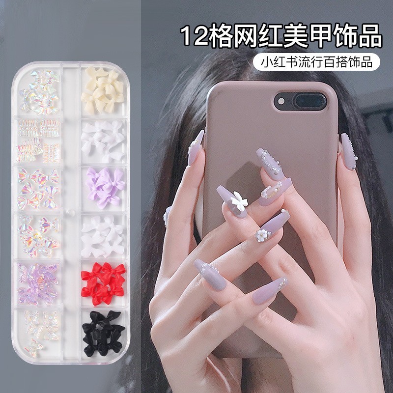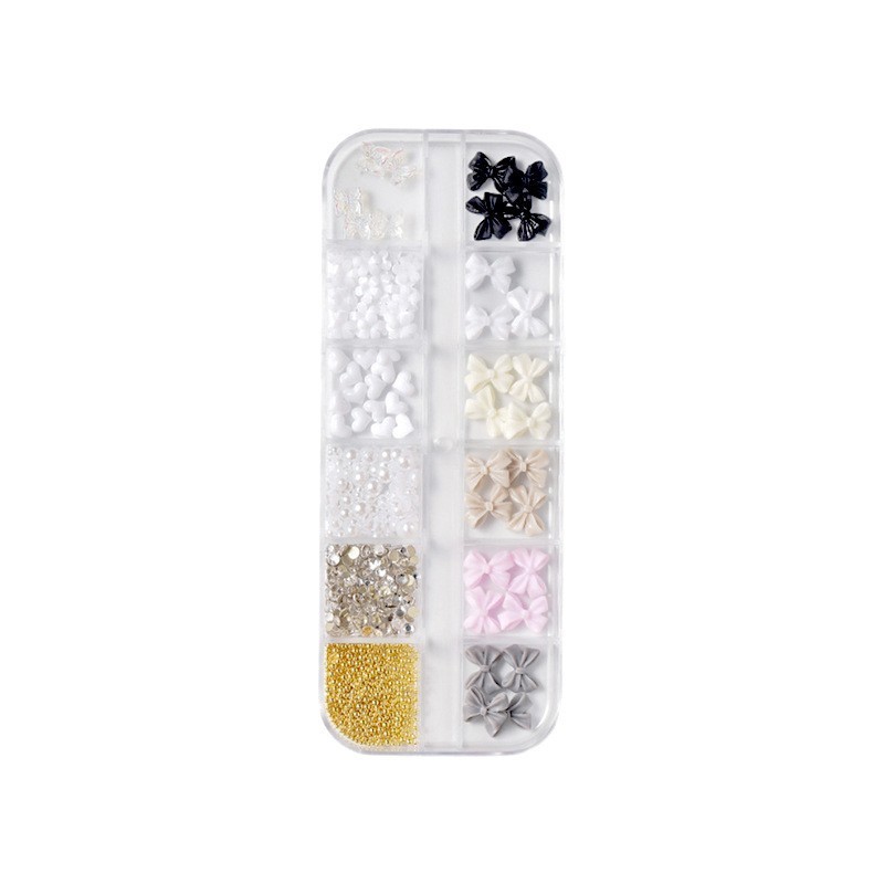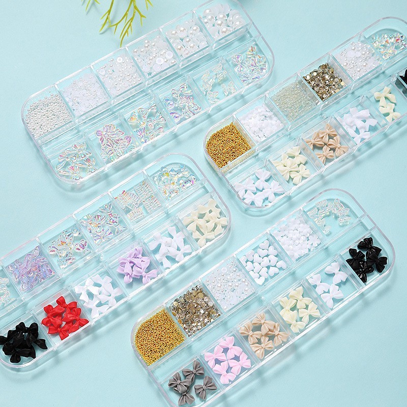 义乌市文钰饰品有限公司发布的美甲饰品极光蝴蝶结珍珠铆钉平底钻混装爆闪白钻钢珠12格饰品图集库