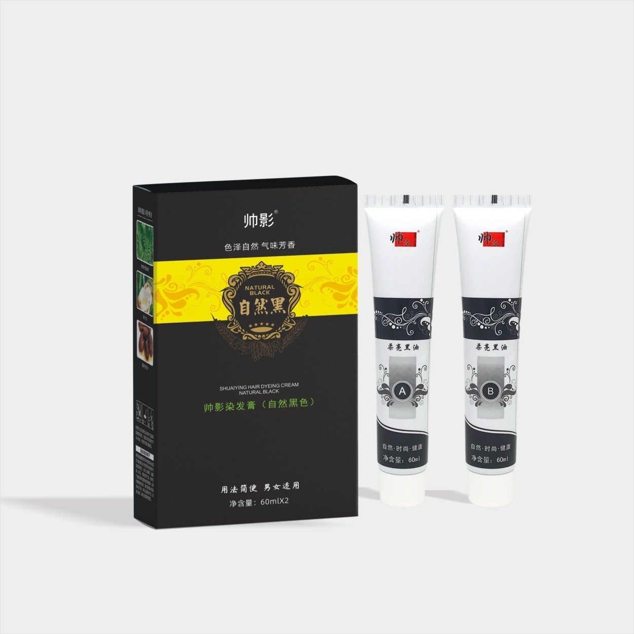 广东帅影医药生物科技有限公司发布的加工定制黑色染发膏 草本精萃黑松宝染发膏60ML黑色遮白发染发剂图集库