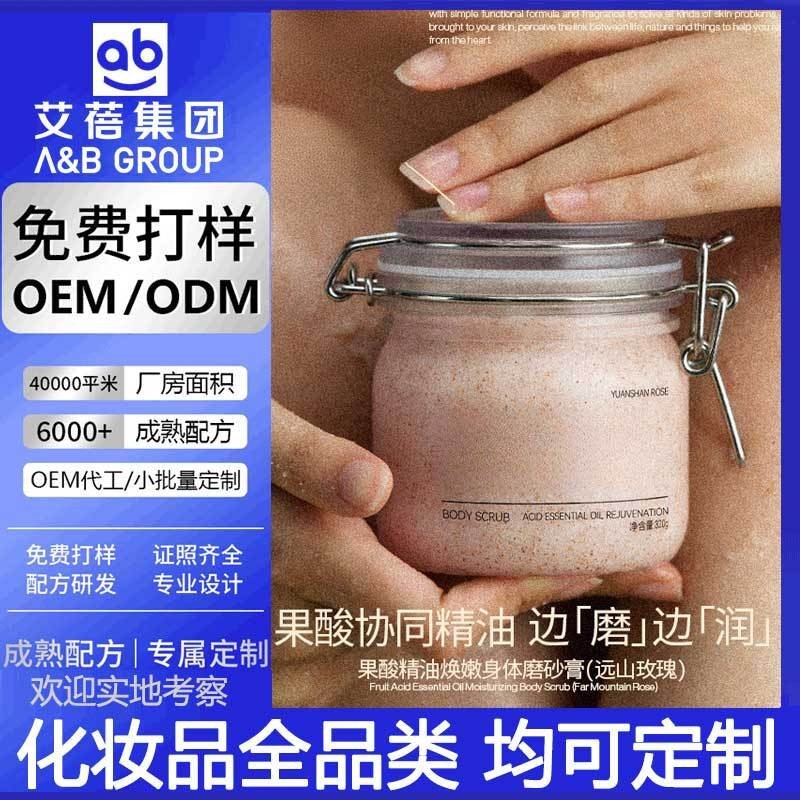 广州艾蓓生物科技有限公司发布的贴牌代加工果酸精远山玫瑰身体磨砂膏去角质保湿水嫩肤化妆品定制图集库